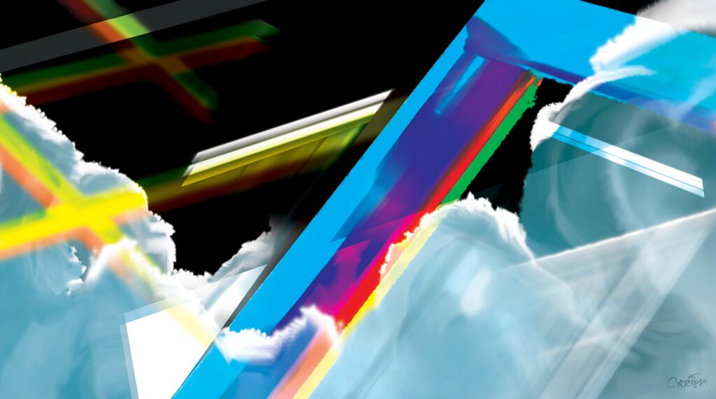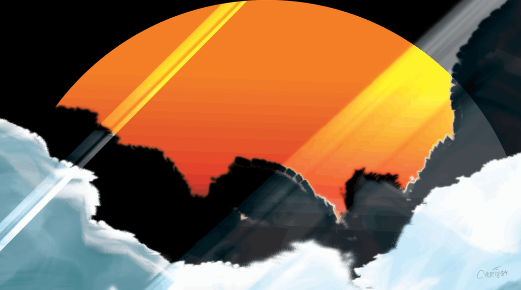 The dawn of vision is revealed through the sun itself. In Rise of New Chromatic Age, hand-drawn digital painting meets oil-like texture and clouded gestures, capturing the moment light first breaks the horizon. It’s a bold, upward composition — quietly powerful at scale.